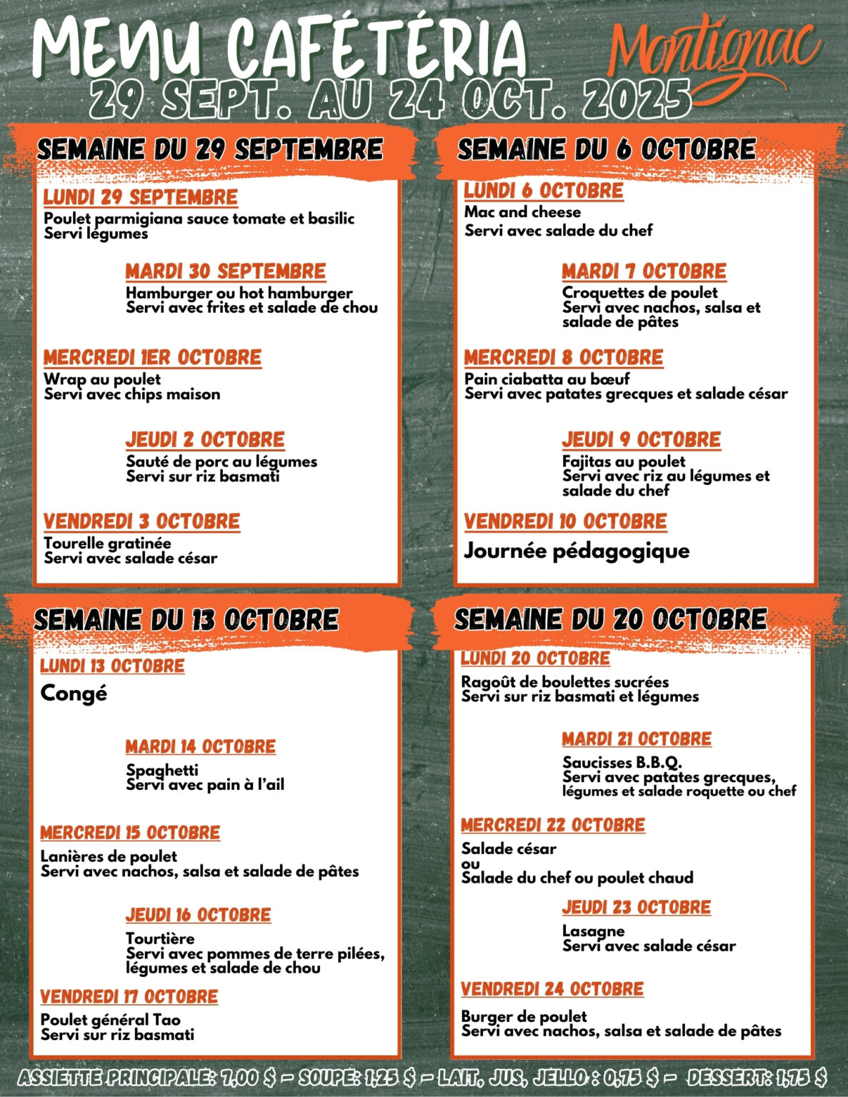 Le coût d’une assiette principale est de 7.00$ incluant le jus ou le jello.